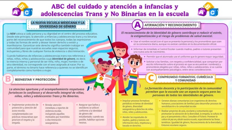 Entre estos se encuentra el ABC del cuidado y atención a infancias y adolescencias Trans y No Binarias en la escuela, que aborda la diversidad de género en la Nueva Escuela Mexicana, la afirmación y reconocimiento de la identidad, el bienestar y protección, además del compromiso formativo.